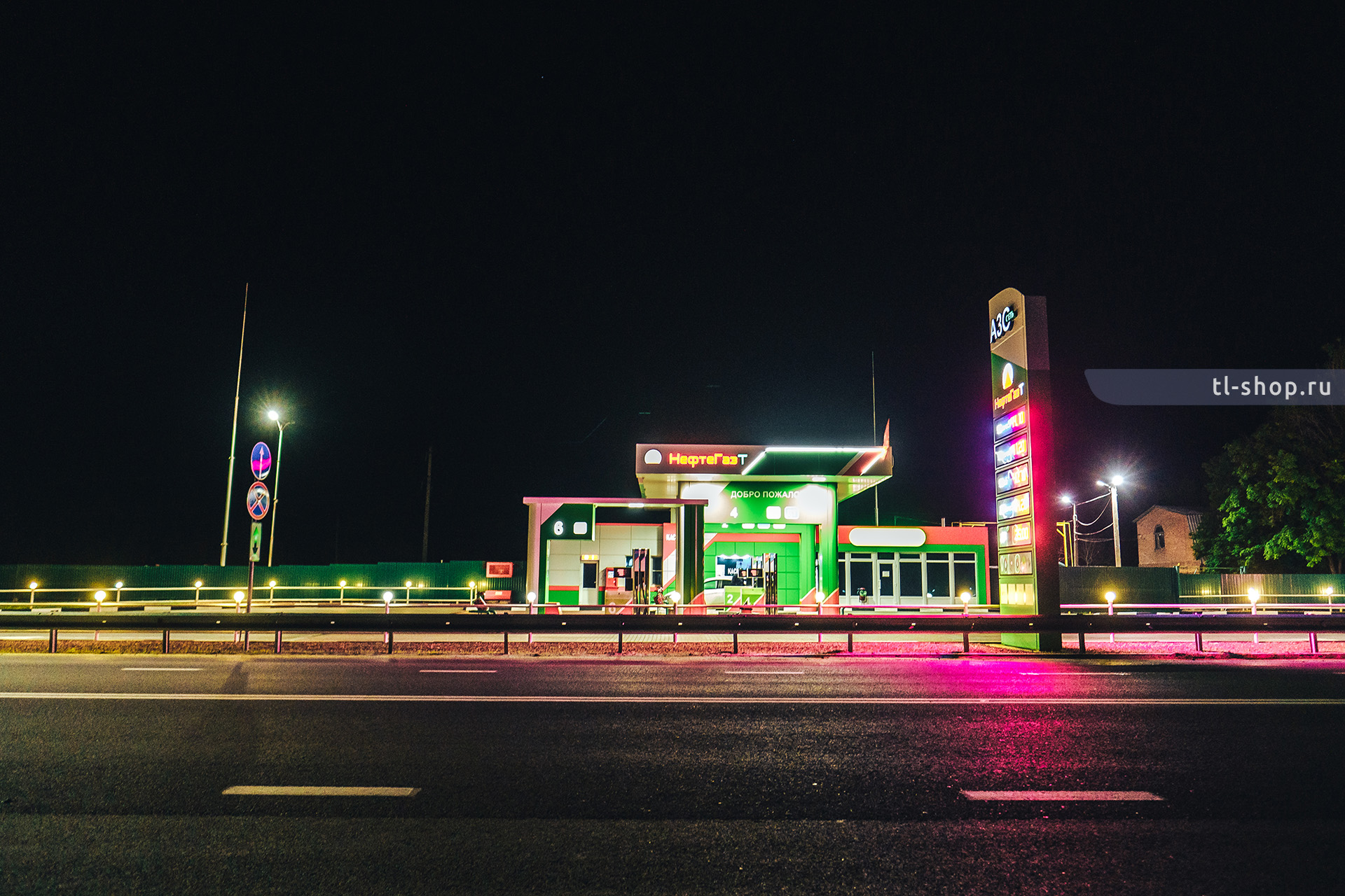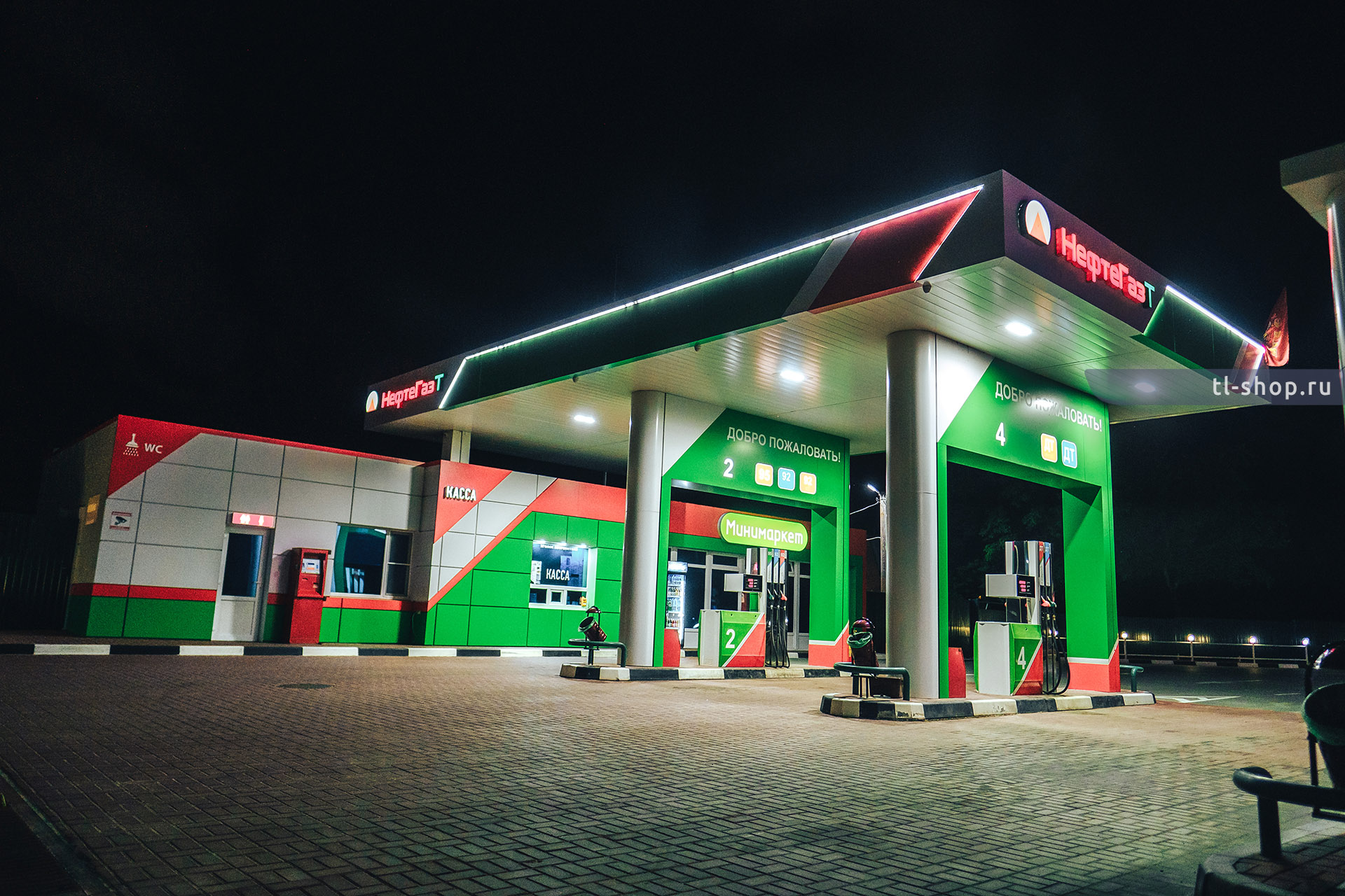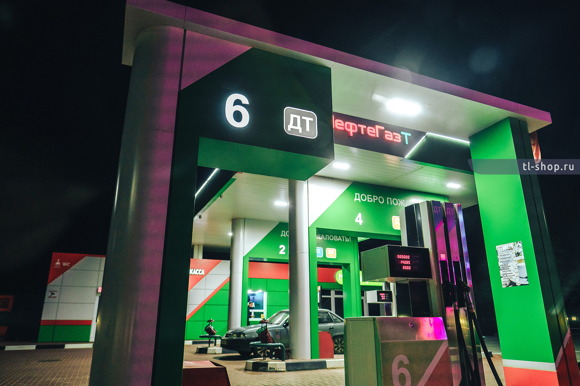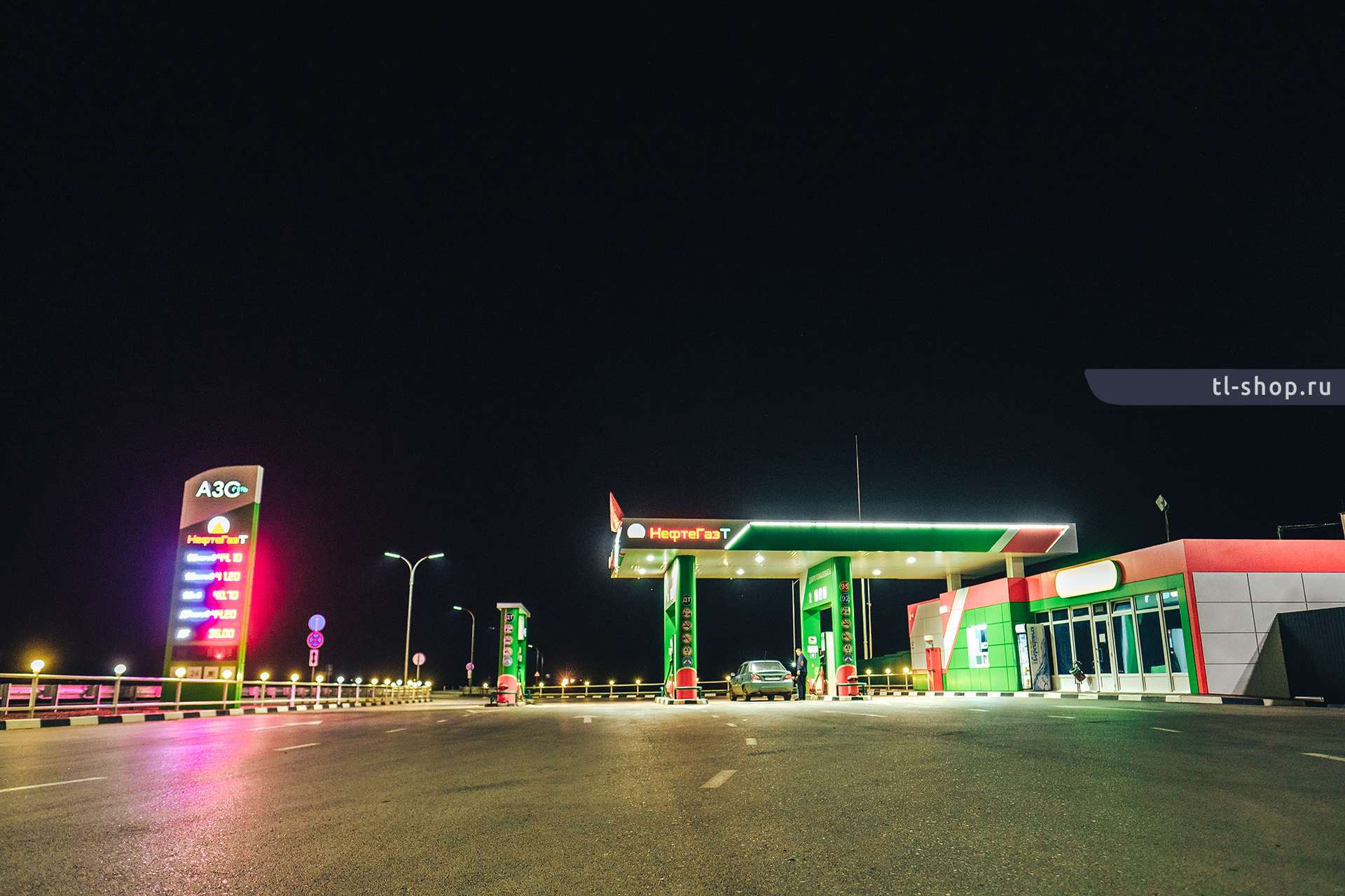 В совокупности светильники потребляет всего 3.5 кВт, ярко освещая всю территорию и привлекая внимание к АЗС. Благодаря сроку службы от 10 лет и снижению расходов на электроэнергию, инвестиция в свет окупится за несколько лет, а дальше будет годами работать в плюс.